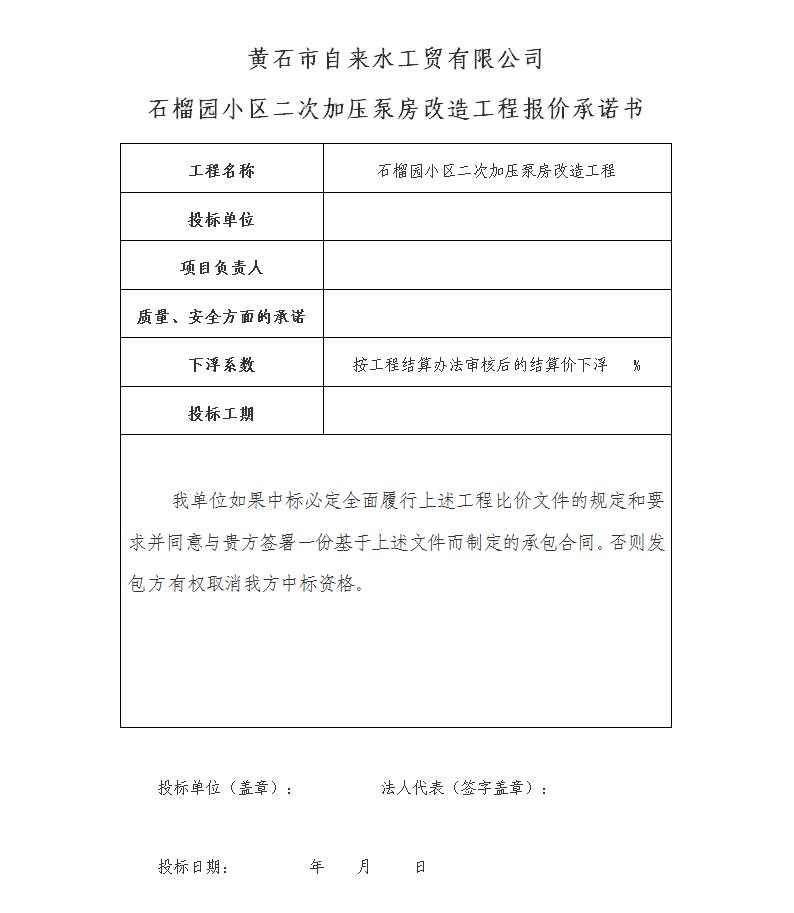 報價文件內(nèi)附:工程報價承諾書、營業(yè)執(zhí)照復(fù)印件、授權(quán)委托書、身份證復(fù)印件。所有證明文件加蓋公章,裝入檔案袋密封并加蓋騎縫章,檔案袋注明石榴園小區(qū)二次加壓泵房改造工程。