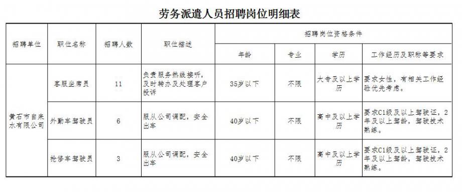 報(bào)名者應(yīng)符合《黃石市自來水有限公司勞務(wù)派遣人員招聘崗位明細(xì)表》(以下簡(jiǎn)稱《崗位表》)規(guī)定的年齡、專業(yè)、學(xué)歷等各項(xiàng)要求。