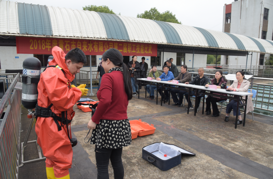 當天上午,首先在公司二樓會議室舉行了“職工技能比武”理論考試。公司領導高度重視,現(xiàn)場巡視??荚囘^程中,參考人員和監(jiān)考人員嚴格遵守考試紀律,參考人員答題認真,監(jiān)考人員監(jiān)考嚴格。在下午的實操考試中,共分為運行值班工比賽、維修電工比賽、水質檢驗工比賽以及防化服穿戴等四個項目。其中,水質檢驗工比賽主要測試職工水質檢驗工基本理論知識和水質日常檢測七項、九項指標基礎理論知識。維修電工比賽需根據(jù)安全技術操作規(guī)程完成試題要求。運行值班工比賽以現(xiàn)場答題的方式,回答評委提出的問題。防化服穿戴比賽,要求兩人一組相互配合,根據(jù)防化服穿戴規(guī)范程序在規(guī)定的時間內正確完成穿戴。