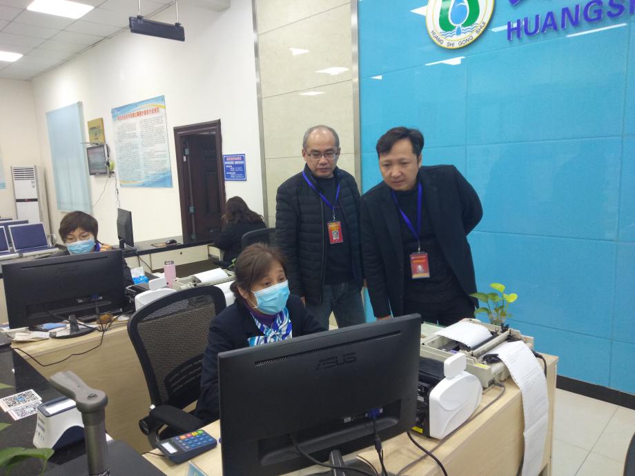 圖為檢查組查看中心收費(fèi)大廳水費(fèi)收繳情況。