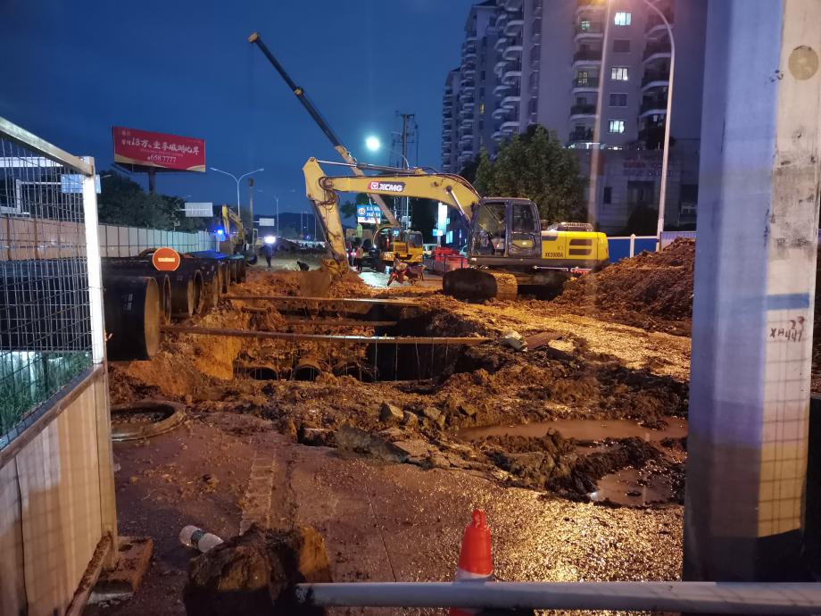 由于天氣等客觀因素,項目部前期已組織施工準備,確保機械、材料、圍護等設施充足,人員現(xiàn)場待命克服雨天困難破路施工,主干道分流后機械進場破路開挖,管道安裝成功迅速完成路面恢復,最大程度降低對市民出行帶來的不便,確保市民假期末回城高峰及節(jié)后上下班正常通行。