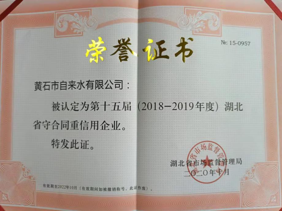 12月3日,市市場(chǎng)監(jiān)督管理局向市自來(lái)水有限公司頒發(fā)湖北省第十五屆(2018-2019年度)“守合同重信用”企業(yè)榮譽(yù)證書(shū)。