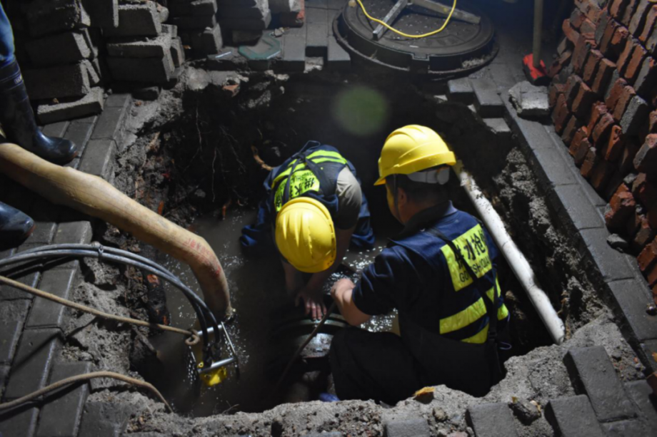 一路風(fēng)塵仆仆,濕透的衣服一直未曾干過。下午17時(shí)許,維修人員結(jié)束下陸萬達(dá)廣場(chǎng)的檢測(cè)后匆匆趕到環(huán)湖路交警大隊(duì)。這里一處水管漏水,水滲透地面,向四周漫延,附近居民水壓低,著急等待搶修人員到來。在漏水的位置確定好漏點(diǎn)后,搶修人員開始犯難了,漏水的地方位于外墻被圍欄環(huán)繞的花壇里,機(jī)器無法開挖。維修人員只有采取人工挖。為避免破壞花壇植被和花壇中PE110戶表管,王明躍決定從花壇底部開挖。一鍬接一鍬、一鏟連一鏟,太陽漸漸隱藏余暉,卻依然肆意散發(fā)著巨大的熱量,夏天不能暢快用水煎熬著用戶的心,成為工人們感同身受的干事動(dòng)力。管道挖掘和搶修一直持續(xù)至次日凌晨3時(shí)左右,維修人員連續(xù)10余小時(shí)的作業(yè),挖出DN300鑄鐵管,焊接好鑄鐵管上60厘米裂縫,恢復(fù)片區(qū)供水。