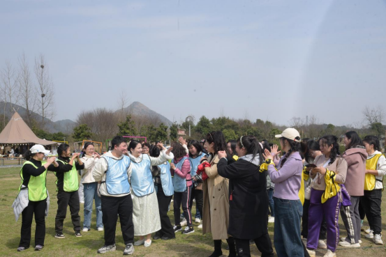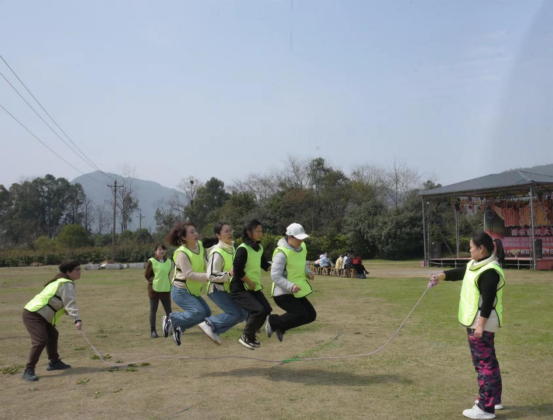 緊接著,女職工們在揉肩捶背、花開花落等熱身破冰運動后,組成5隊進行PK,團建趣味活動內容豐富多彩,既有跳大繩等傳統(tǒng)的體育項目,也有考驗團隊默契配合的“解手鏈”,還有考驗智慧的“算二十四點”。隊員們情緒高漲,各顯神通,使出渾身解數(shù)。整個賽場熱鬧非凡,口號聲、加油聲、吶喊聲、歡笑聲不絕于耳。