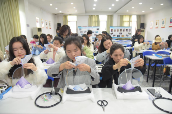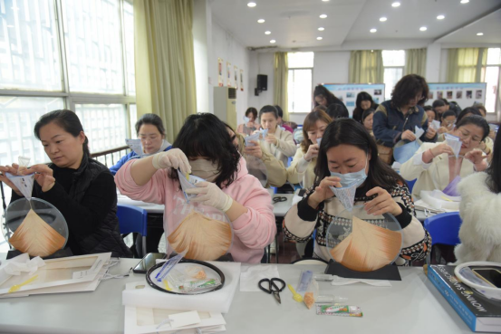 活動開始,在聽完手作老師關(guān)于流沙畫制作過程的介紹,參與活動的女職工們迫不及待開始投入沙畫的創(chuàng)作。將細小的砂礫晶體從兩塊透明玻璃之間的小孔內(nèi)一點點注入,待向玻璃之間注入凈水、封口后,一副層次分明、變化萬千的“治愈系”的沙畫便制作完成了。
