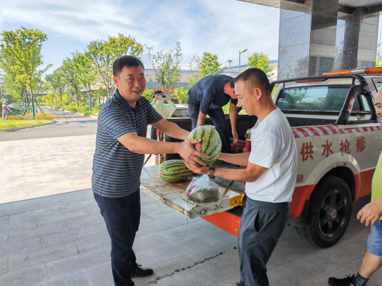 驕陽似火,伏天正盛,酷暑“烤”驗(yàn)著堅(jiān)守在戶外的一線職工。為扎實(shí)做好防暑降溫工作,把集團(tuán)的關(guān)心關(guān)愛送到干部職工的心坎上。7月25日上午,市水務(wù)集團(tuán)兵分四路,深入基層一線和在建工地,開展“送清涼”走訪慰問活動,為高溫下堅(jiān)守崗位的職工送上礦泉水、西瓜、藥品等防暑用品。
