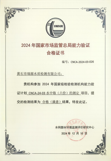 水質(zhì)檢驗?zāi)芰︱炞C是有效提高實驗室能力的重要手段,近期生產(chǎn)運行中心(瑞源水質(zhì)檢測公司)參加2024年國家級能力驗證計劃“水中鉻(六價)的測定”國家級能力驗證項目,順利通過水利部水環(huán)境監(jiān)測評價研究中心考核,評價結(jié)果為合格(滿意)。