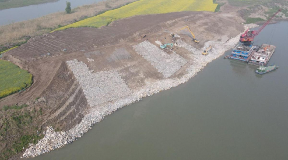 不遠(yuǎn)處,長(zhǎng)江中的取水頭部施工同樣熱火朝天。幾臺(tái)大型吊裝設(shè)備在江面作業(yè),挖掘機(jī)轟鳴,多名工人忙著安裝格賓石籠。“取水頭部設(shè)置2個(gè)特定規(guī)格的取水喇叭管,中心設(shè)計(jì)高程為-4.9米?!惫ぷ魅藛T指著施工圖紙介紹,目前,水下清淤和岸邊修整已完成,正進(jìn)行格賓石籠安裝。