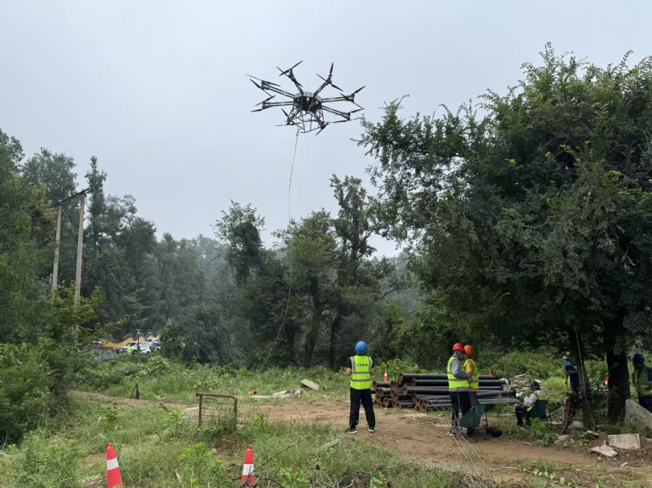 為攻克這一難題,工程公司積極響應(yīng)國家發(fā)展低空經(jīng)濟(jì)政策,大膽引入無人機(jī)進(jìn)行低空吊裝轉(zhuǎn)運(yùn)。過去,材料人工運(yùn)輸需要近一個(gè)月時(shí)間,如今采用無人機(jī)運(yùn)輸在天氣允許的情況下,僅8天即可完成。無人機(jī)最大承載達(dá)230Kg,單次續(xù)航30分鐘,配合移動(dòng)快速充電站,通過換電可實(shí)現(xiàn)連續(xù)10小時(shí)不間斷工作,轉(zhuǎn)運(yùn)效率較以往提高數(shù)倍,極大地加快了項(xiàng)目建設(shè)進(jìn)程。