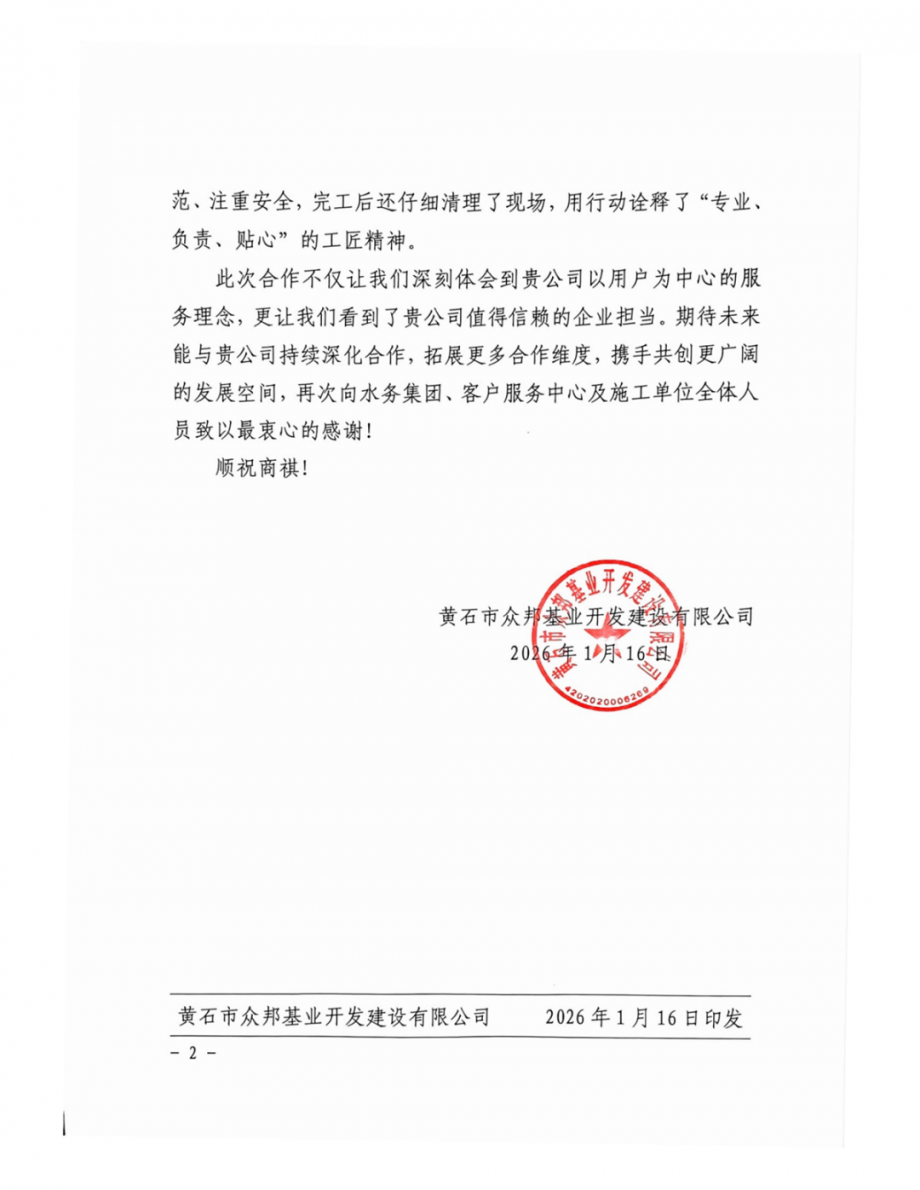 “此次合作讓我們深刻體會到水務(wù)集團(tuán)以用戶為中心的服務(wù)理念,更看到了值得信賴的企業(yè)擔(dān)當(dāng)?!北姲罨鶚I(yè)開發(fā)公司在感謝信中表示,期待未來與水務(wù)集團(tuán)持續(xù)深化合作,拓展更多合作維度?! ?